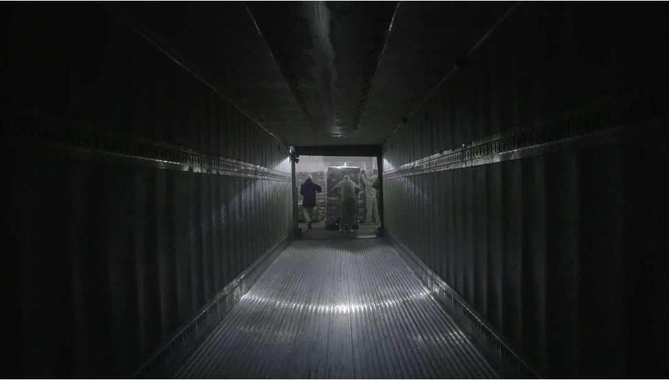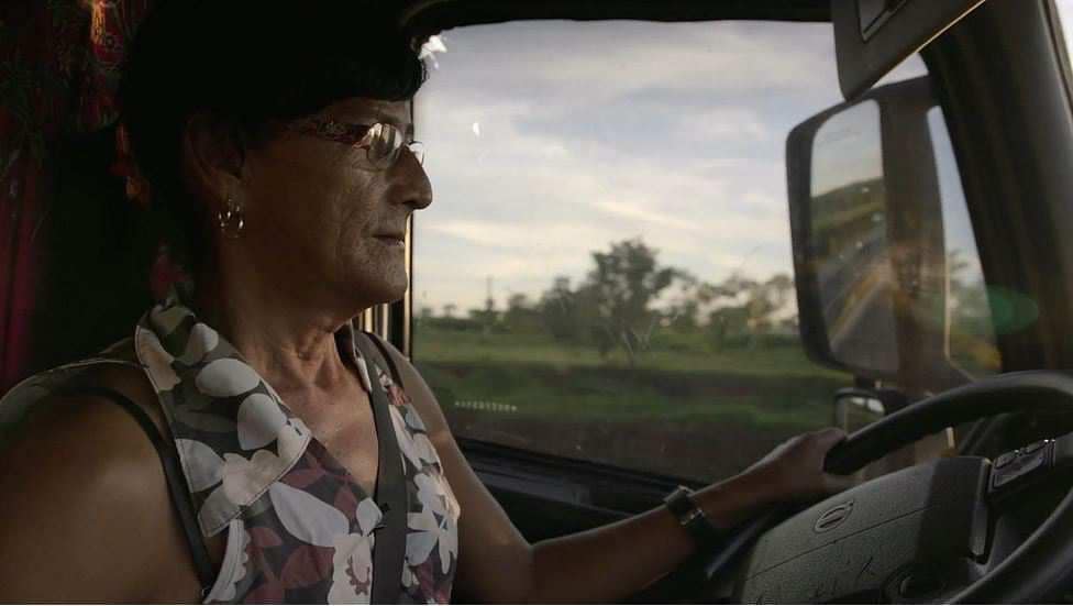 A diretora lida com esse claustro de forma equilibrada pois vemos outros ambientes, obviamente, mas, em determinados momentos a câmera parece transmitir essa sensação de “foco gregário”, fixo, na personagem enquanto o mundo escorre fluido pela janela. Vemos o mundo parado, nas paradas; sim, eu sei que isso parece obviedade pleonástica, mas quem já viajou de ônibus ou carro por longas distâncias compreenderá o que digo, a sensação do estático do mundo; sim, vemos encontros da personagem com outras pessoas, mas também vemos o interior da caçamba sendo descarregada, numa filmagem simétrica, centralizada, enfatizando o aspecto de um box enclausurado. É um documentário muito profissional, mas tem essas oposições binárias, talvez incontornáveis, entre o antigo e o moderno, entre o fixo e o móvel, o fechado e o aberto, inescapáveis, penso eu, e obviamente falo de uma interpretação pessoal.